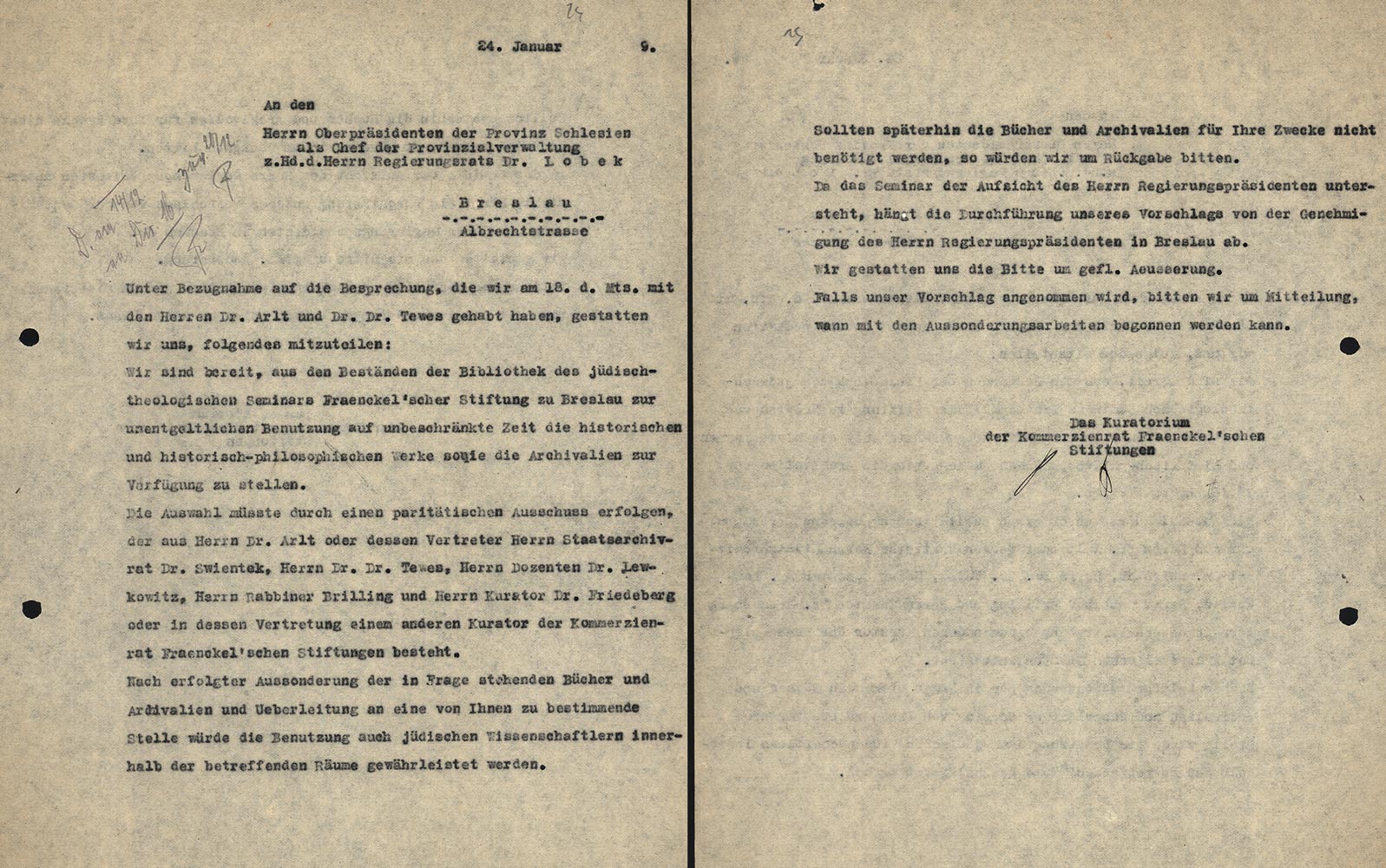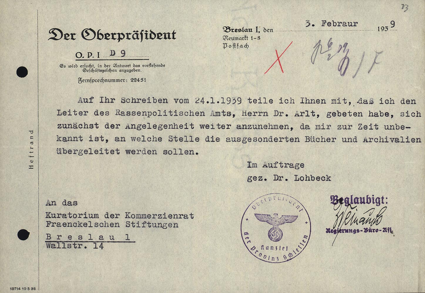 Kuratorium Rady Handlowej Fundacji Fränckla usiłowało uratować uczelnię i bibliotekę od całkowitego unicestwienia. Próbowano nawet pertraktacji z hitlerowskimi urzędnikami. Aby uniknąć konfiskaty zbiorów i pomieszczeń, członkowie kuratorium zaproponowali utworzenie muzeum i archiwum żydowskiego oddanych do dyspozycji władz. Inicjatywa nie uzyskała jednak aprobaty ze strony urzędników. W marcu 1939 roku, zgodnie z zarządzeniem Reichsführera SS Heinricha Himmlera, przejęto wykazy książek, kilka miesięcy później cały księgozbiór biblioteki Żydowskiego Seminarium Teologicznego został zarekwirowany.